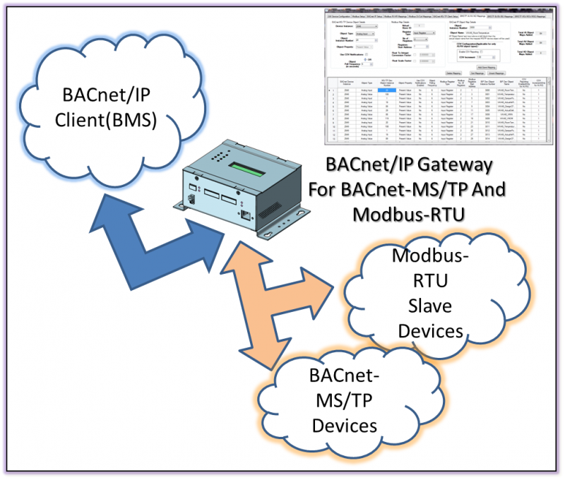 A BACnet-MS/TP and Modbus-RTU to BACnet/IP protocol converter product used to integrate the popular and widely deployed BACnet-MS/TP and Modbus-RTU protocol based field devices into a BACnet/IP protocol based building management system or automation controller. The Gateway supports all the standard BACnet Server functions including some features like BBMD, COV Notifications and Alarm Events. A sophisticated Windows based GUI application provides for easy and quick creation of BACnet-MS/TP device objects and Modbus-RTU device data-points mappings and configuration.